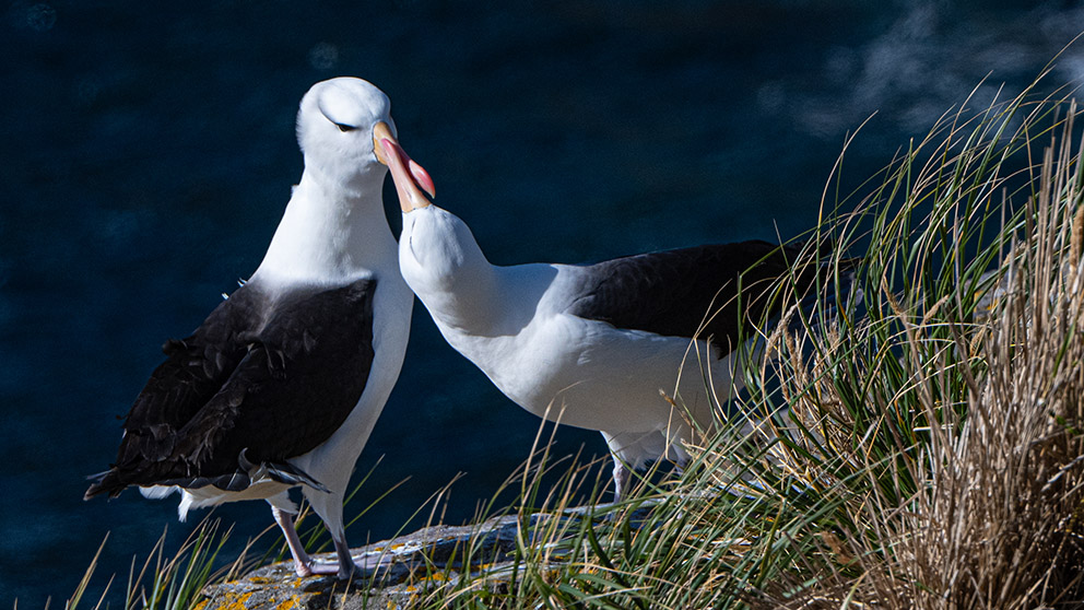 7)福克兰群岛是已列入濒危动物名录的黑眉信天翁(Black-browed Albatross)的最大栖息地。这种信天翁翼展达2米多。可以轻易地借助风力以动态滑翔技术飞行数千公里。它们寿命为40-60岁,终身一夫一妻。这是两只正在喙吻的黑眉信天翁