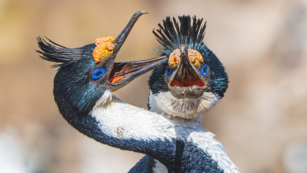 9)蓝眼鸬鹚是一种能飞能潜的海鸟。在求偶繁殖期有着明亮的蓝眼圈和橙色的额疣