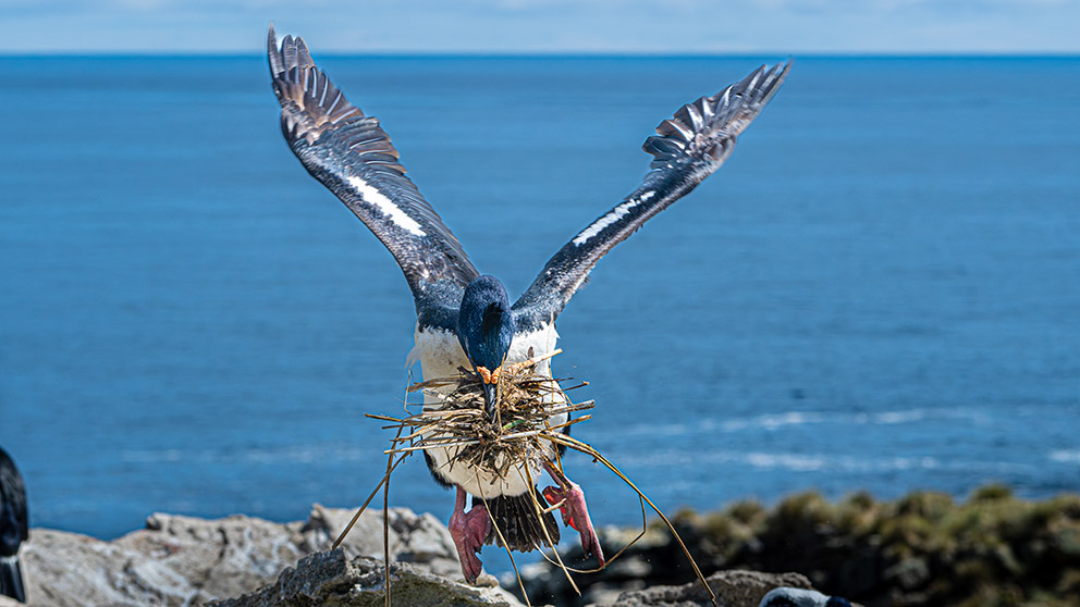 8)一只蓝眼鸬鹚(Blue-eyed Shag)收拾了不少建筑材料用来筑窝