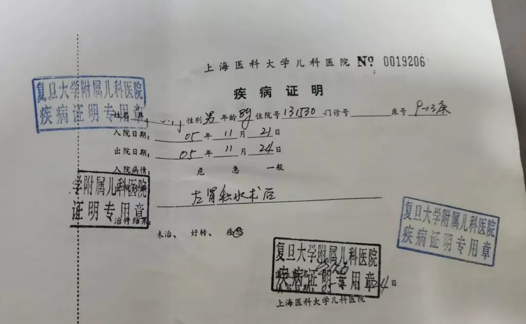 2005年,8岁的俞坚由于左肾先天性肾盂输尿管连接部狭窄,接受了左肾积水手术,他向南方周末记者提供的复旦大学附属儿科医院开具的疾病证明显示,治疗后已“痊愈”。但手术没有抹除疾病的全部痕迹,他后来的体检报告显示,左肾肾盂分离了约9mm。