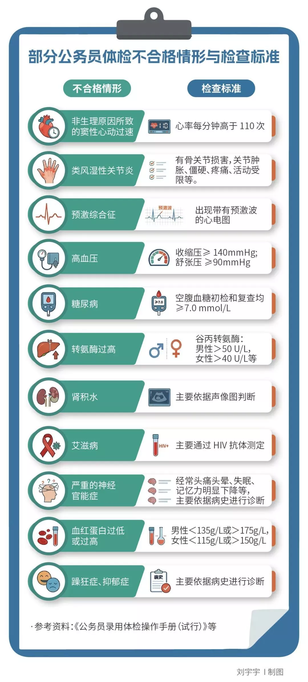 一般而言,公务员招录会经历笔试、面试等环节。只有最终合格的拟招录人选会参与体检,而体检的流程与标准,主要依照人力资源社会保障部等部门2016年修订的《手册》和《国家公务员录用体检通用标准(试行)》(下称《标准》)。其中《手册》近10万字的篇幅中规定了数十种体检不合格情形。