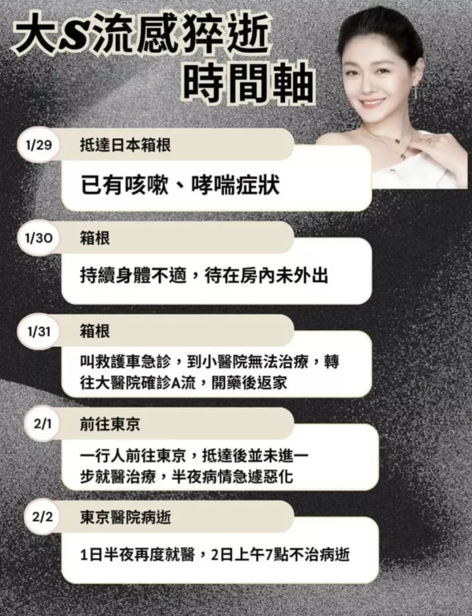 2025年1月30日~31日,大S病情加重,叫了救护车前往医院急诊,得知小医院无法治疗,院方建议转诊;