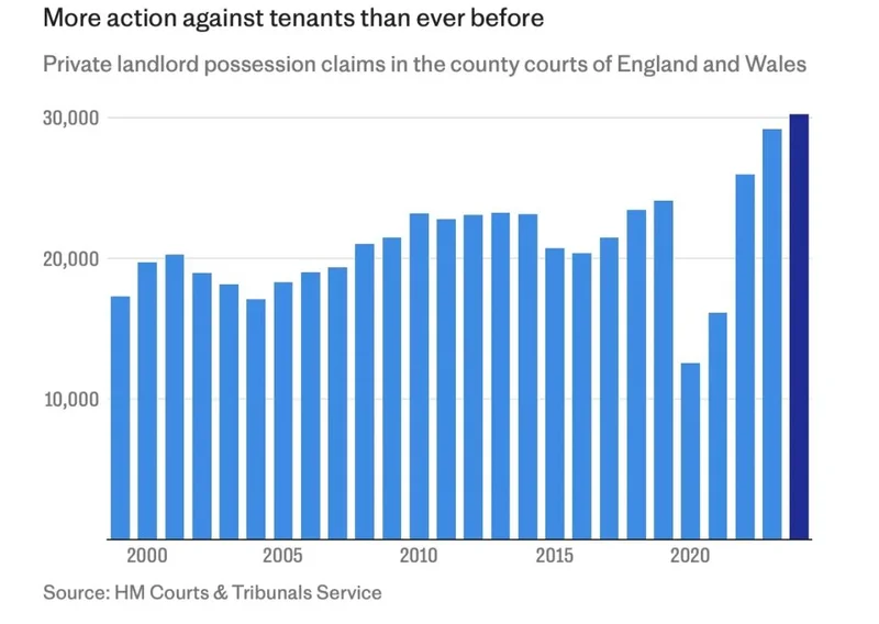 根据英国司法部数据,2024年后,因房租拖欠进入法院的案件数量持续上升,排期时间明显拉长。