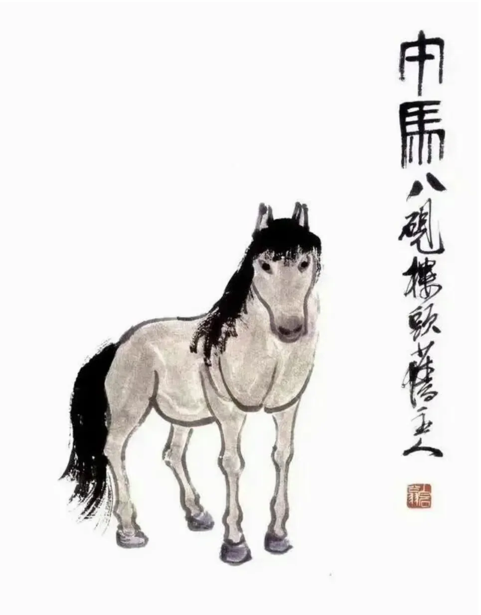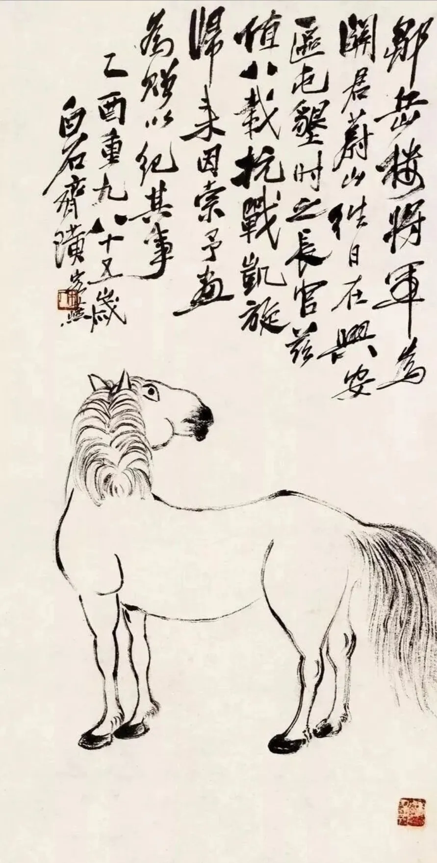可别真以为老爷子是画错了,这波操作藏着满满的巧思。这幅画是齐白石86岁高龄时,专门为抗日名将马占山所作。马将军姓马,画马相赠既贴合姓氏,又寓意骁勇善战、旗开得胜,妥妥的“一箭双雕”。老爷子深耕大写意多年,主张“妙在似与不似之间”,在他眼里,画马不必拘泥于筋骨细节,要的是那份奔腾的意气与祝福的心意。