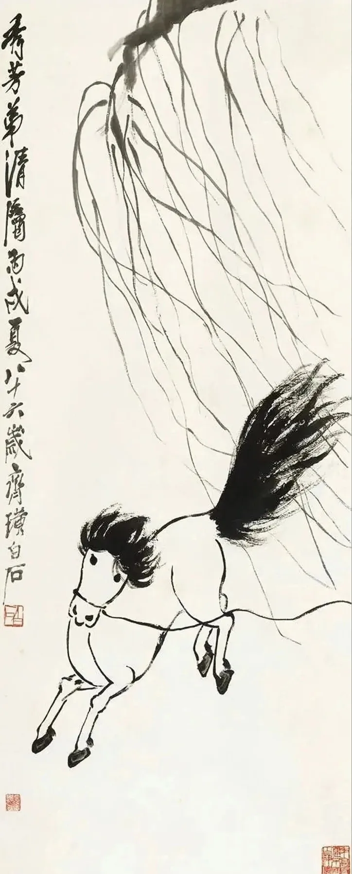 说起来,这匹马能拍出1380万天价,绝非“靠梗出圈”。一方面是物以稀为贵,齐白石一生主攻花鸟虫鱼,画马的作品屈指可数,堪称“限量款”;另一方面,笔墨里的功底藏不住——浓墨泼洒的鬃毛自带动感,淡墨勾勒的柳枝虚实相生,简单几笔就定格了“欲奔未奔”的张力,把大写意的精髓玩到了极致。所谓的“像驴”,恰恰是老爷子挣脱传统束缚的童趣表达。