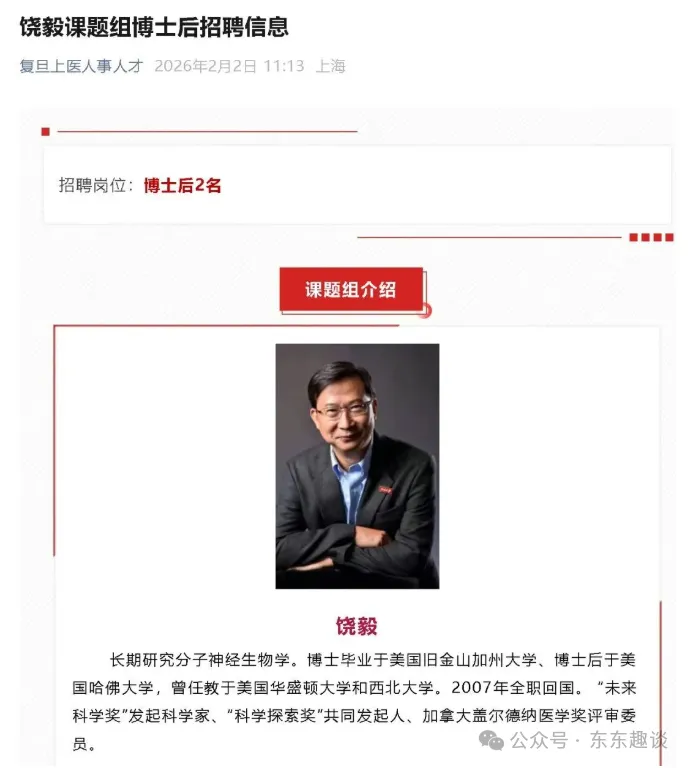 复旦大学“复旦上医人事人才”的招聘信息,等于证实了2025年年尾传闻饶毅教授加盟复旦大学的消息属实。不过后面还有一个传闻,对饶毅不是很友好,有兴趣的网友自己去搜一下!
