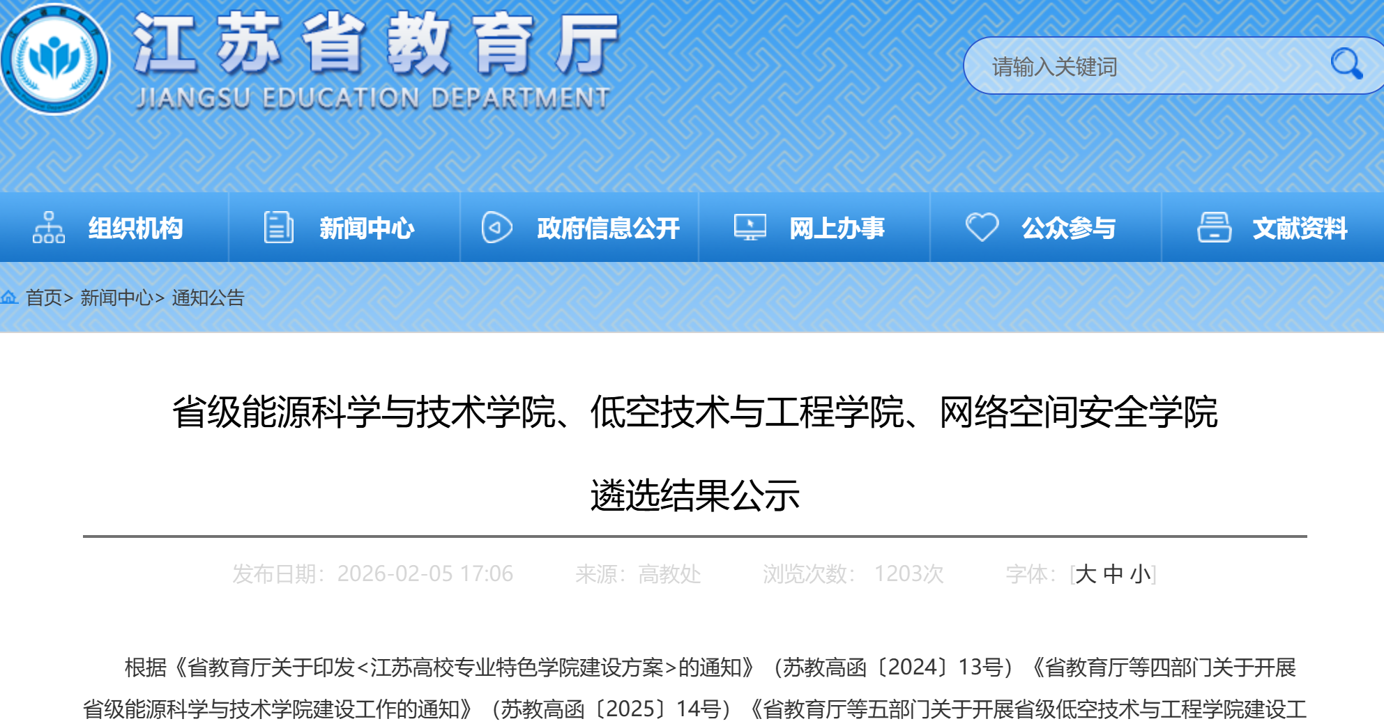 根据《省教育厅关于印发的通知》(苏教高函〔2024〕13号)《省教育厅等四部门关于开展省级能源科学与技术学院建设工作的通知》(苏教高函〔2025〕14号)《省教育厅等五部门关于开展省级低空技术与工程学院建设工作的通知》(苏教高函〔2025〕15号)《省教育厅等五部门关于开展省级网络空间安全学院建设工作的通知》(苏教高函〔2025〕16号)要求,经高校申报、材料初审、专家审核等程序,拟立项建设13个省级能源科学与技术学院、10个省级低空技术与工程学院、9个省级网络空间安全学院,现予以公示(具体项目名单见附件)。公示时间为2026年2月5日至2月11日。