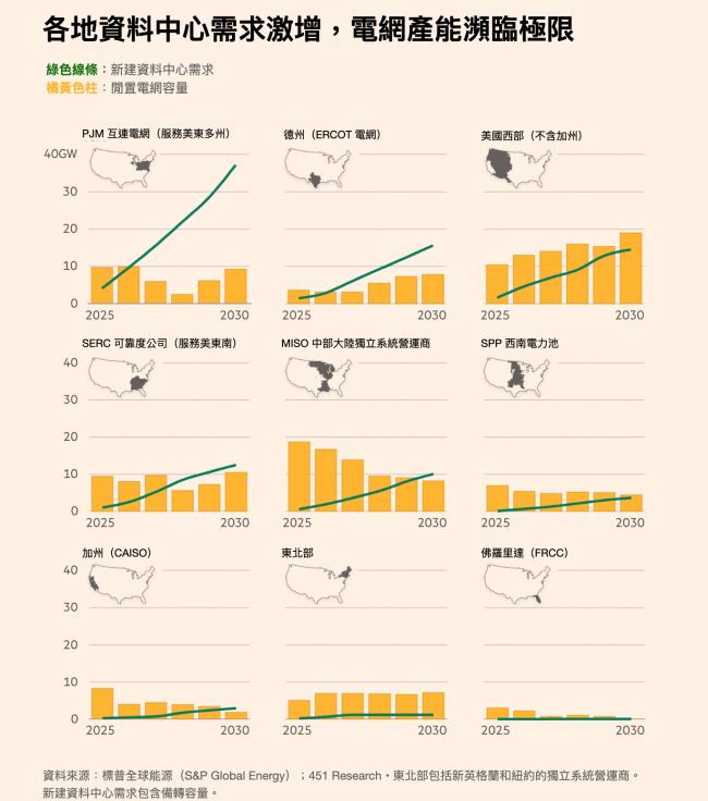 “赢得美中 AI 竞赛”是川普 7 月行政命令的目标,这需要紧张的电网向资料中心提供大量电力。根据研究机构 BloombergNEF 的数据,资料中心的电力需求将从 2024 年的 34.7 GW激增至 2035 年的 106 GW,相当于超过 8000 万户家庭的用电量。谘询公司 ICF 更预测,与 2023 年相比,美国整体电力需求预计到 2030 年将成长 25%、到 2050 年将成长 78%。