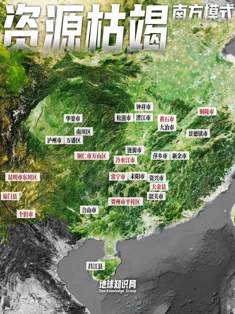 这里面最有南方特色的,毫无疑问是十大有色金属枯竭城市。包括4座铜枯竭,2座锡枯竭