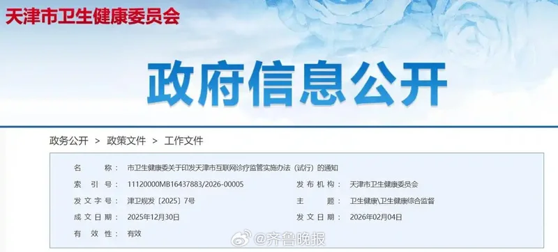 《天津市互联网诊疗监管实施办法(试行)》最近印发实施,其中,最让人关注的一点是“严禁使用AI等技术自动生成处方”。