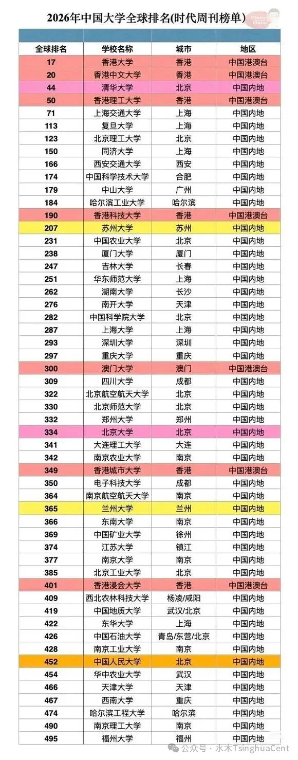 TIME2026排名:中国高校排行版水木TsinghuaCent