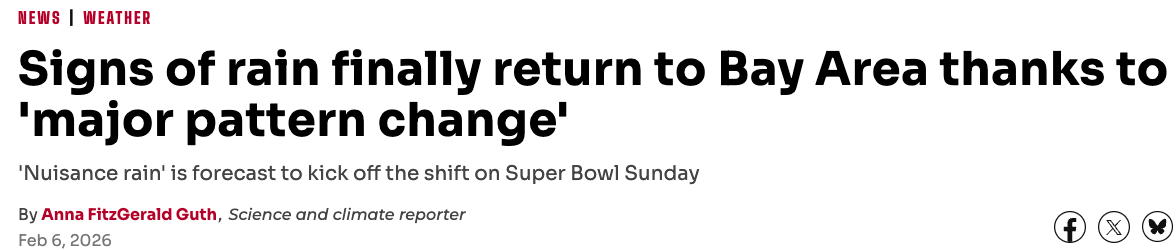 不过,这轮降雨对本周末将在圣克拉拉李维斯体育场(Levi’s Stadium)举行的超级碗赛事影响不大。气象部门预测,周日傍晚后,南湾出现小雨的概率不足15%,更明显的降雨可能要到下周初才会出现。