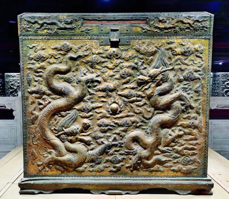 “金匮库”位于档案馆4层。“金匮”即铜皮镶金、雕饰龙云的木柜。柜长135厘米,宽75厘米,高130厘米,每个金匮需要用到2斤左右的黄金。柜盖严丝合缝,密闭性极佳,加之厚重铜锁,使得金匮具有防潮、防霉、防虫与防盗的多重功能。