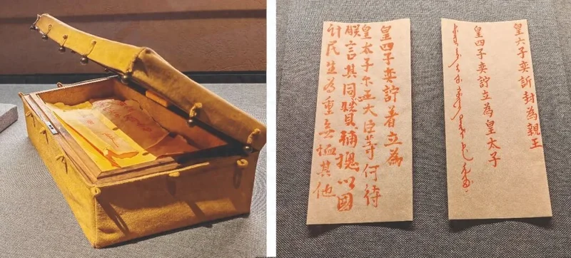 秘密立储匣一般只装有一份立储谕旨,而“道光帝秘密立储谕旨并匣”内却藏有道光二十六年(1846年)亲笔所写遗诏两份。其中,一张书写:“皇四子奕詝着立为皇太子……同心赞辅总以国计民生为重无恤其他。”另一张为满汉双语遗诏:“皇四子奕詝立为皇太子”,同时又用汉文书写:“皇六子奕訢封为亲王”。两份遗诏足以窥见道光帝立储时的艰难抉择。