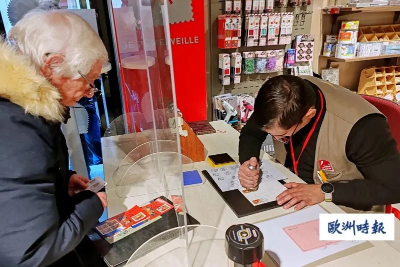▲ 法国当地时间2026年2月6日,法国邮政在位于巴黎圣拉扎车站附近的法国邮政集邮墨方厅举行农历丙午马年生肖邮票的首发仪式。图为马年邮票设计师陈江洪(左)为集邮爱好者签名留念。