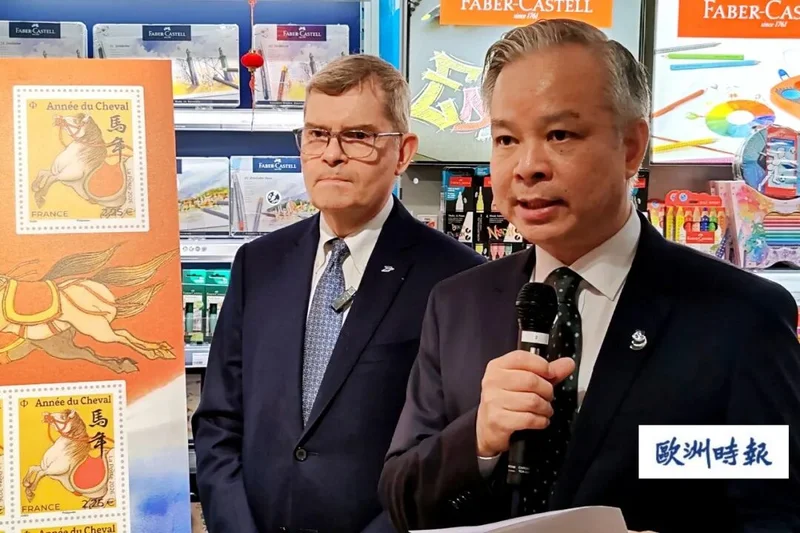 ▲ 法国当地时间2026年2月6日,法国邮政在位于巴黎圣拉扎车站附近的法国邮政集邮墨方厅举行农历丙午马年生肖邮票的首发仪式。中国驻法公使陈力出席首发仪式并致辞。