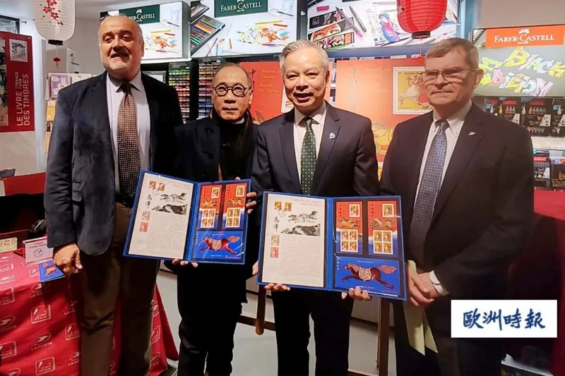 ▲ 法国当地时间2026年2月6日,法国邮政在位于巴黎圣拉扎车站附近的法国邮政集邮墨方厅举行农历丙午马年生肖邮票的首发仪式。图为法国邮政欧洲和国际关系总监富瑟维勒(Jean Paul FORCEVILLE)(右一)向中国驻法公使陈力(右二)、旅法艺术家、马年邮票设计师陈江洪(左二)赠送马年邮票纪念品。