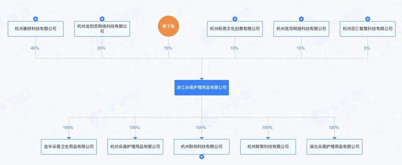 浙江朵薇护理用品有限公司股权全景图 图片来源:天眼查浙江朵薇护理是朵薇的核心生产工厂。该公司的股东信息显示,黄子韬直接持股15%,间接持股比例4.312%。其他两大股东分别是杭州衡研科技有限公司和杭州龙则灵网络科技有限公司,两家公司分别持股40%和20%。