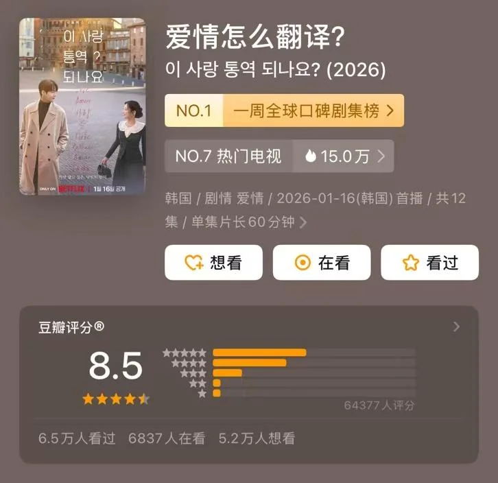 以上画面,都出自网飞韩剧《爱情怎么翻译?》。谁承想,就是看起来如此“俗套”的剧,成为了2026年第一部大爆款,上线三天便拿下全球非英语电视节目排行榜Top 2。而刷剧上头的网友们,更聚焦于对“双重人格”“回避型依恋”等设定的讨论。