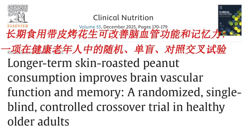 《临床营养学》上的一项研究还发现,长期食用带皮烤花生的参与者,大脑血流量增加3.6%,灰质(负责高级认知功能)血流量增加4.5%,语言记忆表现提高5.8%!