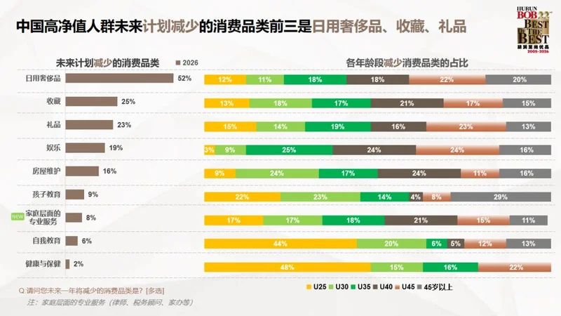 胡润研究院近日发布的《2026中国高净值人群品质生活报告》显示,470名平均家庭总资产6100万元的受访者,未来计划增加消费的前三品类旅游排在首位,减少消费的前三品类日用奢侈品第一。