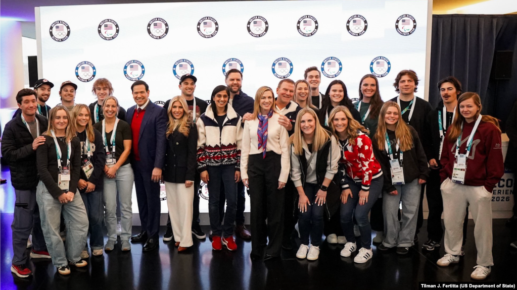 美国副总统万斯和国务卿卢比奥与参加2026米兰科尔蒂纳冬奥会的美国代表团成员合影。(2026年2月4日)