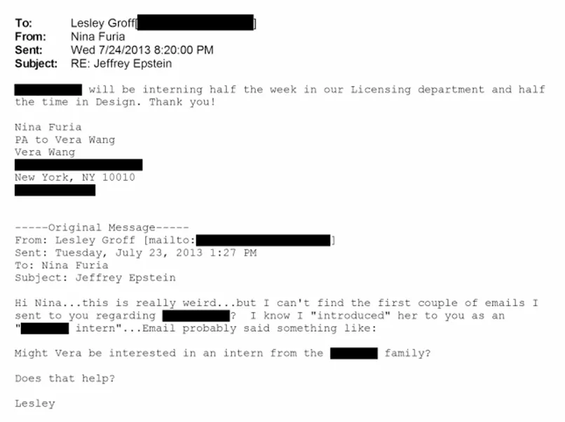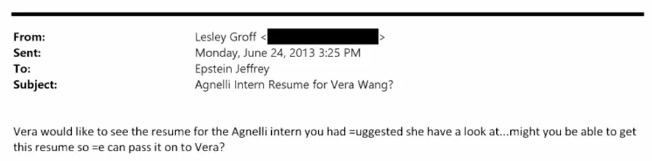 从邮件中看,爱泼斯坦似乎是个为权贵们介绍实习工作的中介,而邮件中提到的阿涅利家族,是意大利甚至欧洲都响当当的“老钱”家族。你可能没听过阿涅利家族的名号,但你一定知道菲亚特汽车(一百多年前由阿涅利家族创办),如今他们的产业版图宏大,通过投资平台EXOR覆盖汽车(法拉利、玛莎拉蒂)、金融(PartnerRe保险)、媒体(《经济学人》)、足球(尤文图斯俱乐部)等领域,深度影响着欧洲政经格局。他们家族最出名的要数贾尼·阿涅利,妥妥的意大利商界教父级人物。简单来说,这个姓氏就代表着财富、权力和人脉。所以邮件里轻飘飘一句“阿涅利家的实习生”,其实也不是商量,更像是通知,简历也基本只是走个过场而已。实习生邮件中提到的Vera Wang这个牌子,可以说是婚纱界的天花板,在曝光的邮件里,实习生Maxim Churkin甚至还不是家族的核心人物。可见,特权圈子里的人情往来,大牌也得乖乖配合,给这些继承者们开后门。