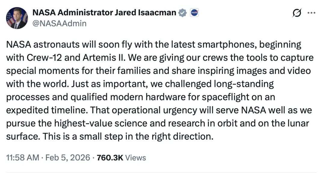 随着Crew-12将于2026年2月11日发射,以及载人绕月任务阿尔忒弥斯2号计划于3月启航,我们或许很快就能在社交平台上,看到宇航员用iPhone自拍的“月球视角”短视频。