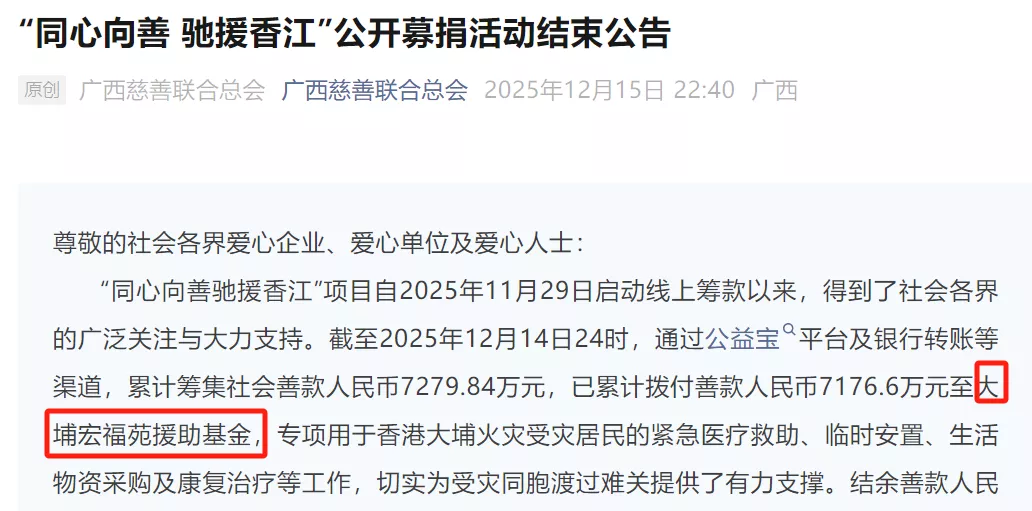 这次港府设立了大埔宏福苑专项基金。许多企业/个人/内地公益组织都是直接给这个账户打钱。这是最保险也最省力的方式。