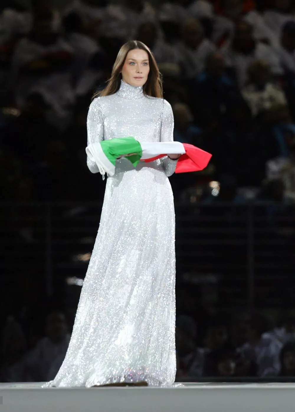 20年前在都灵冬奥会的开幕式上,老牌意大利超模卡拉·布吕尼也同样身着阿玛尼的作品亮相,镶嵌了无数个亮片的晚礼裙在灯光的映照下更显夺目。