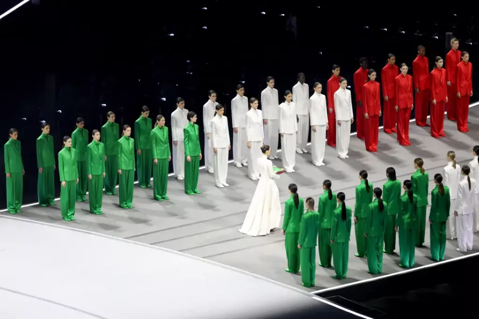 现年27岁的切雷蒂,随后将手中的白红绿三色国旗,转交给了科拉齐耶里仪仗队的代表。挽着发髻亮相的她,呈现出少有的庄重感,却也被观众们所欣赏。