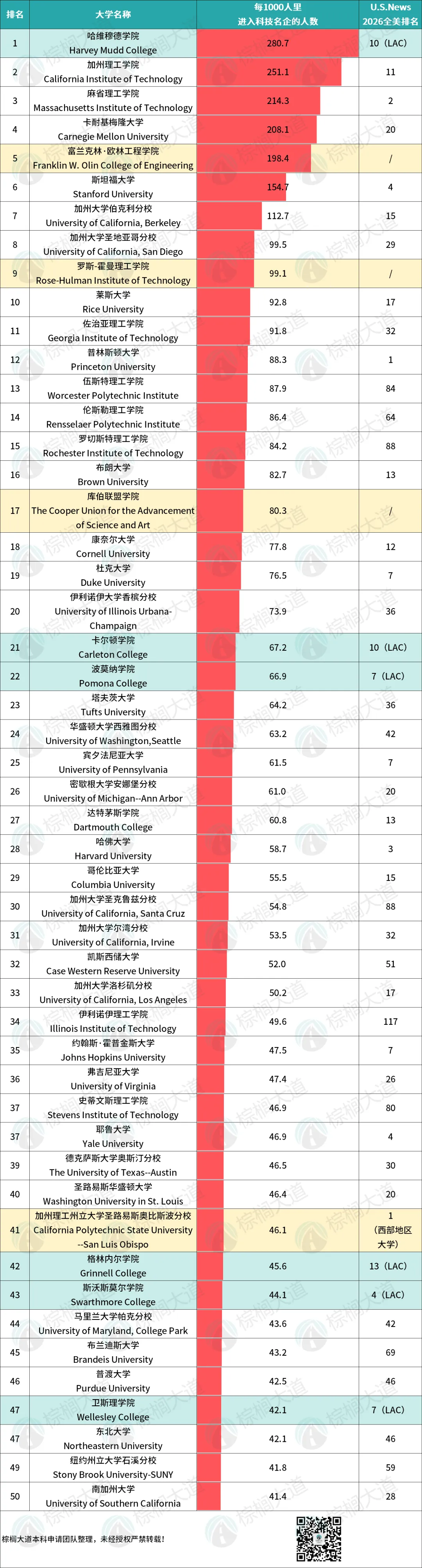 这样有效避免了因学校规模不同而导致的偏差(如公立大学人数多,进入企业人多而排名占优,文理学院人数少,进入企业人少而排名处于劣势),从而更客观地估量一所大学在科技行业的就业竞争力。