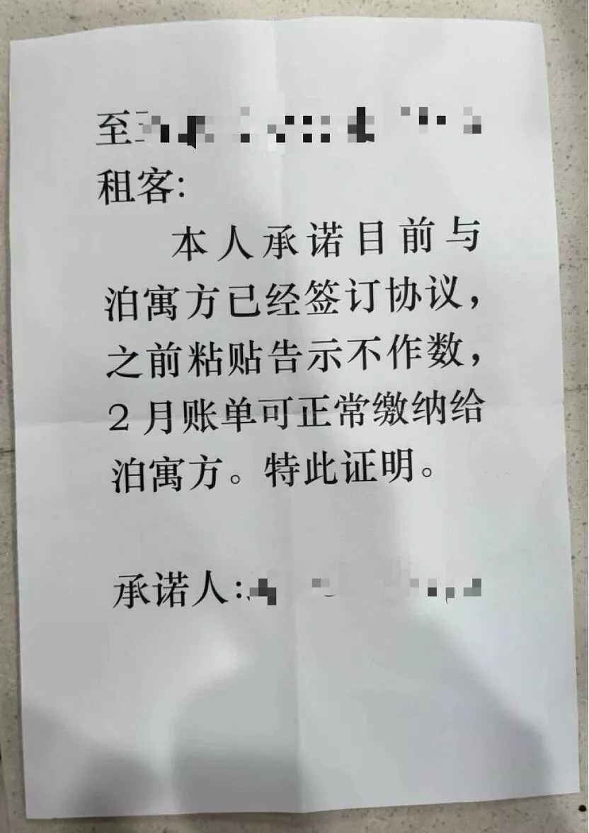 1月28日,或许是帖子引起的连锁反应,泊寓工作人员约他和几位群友在大堂,当面告知他们,已经和房东协商好相关事宜,一切照常运转。2月3日,他们收到房东的声明,有人拍照发到群里,房东承诺已经与泊寓方签订协议,2月账单可以正常缴纳给平台。