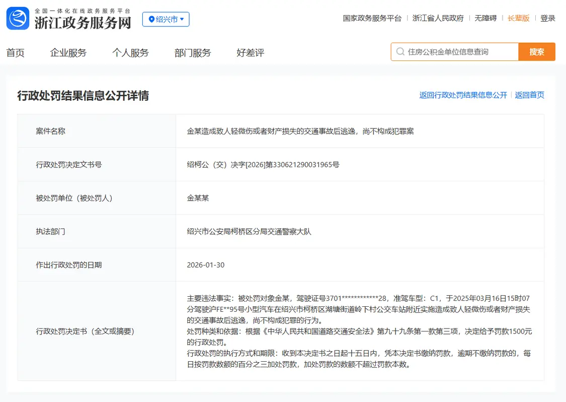2026年2月7日,凤凰网在浙江政务服务网查询到,浙江省绍兴市柯桥区分局交通警察大队已于2026年1月30日,对演员金晨肇事逃逸案件作出行政处罚。