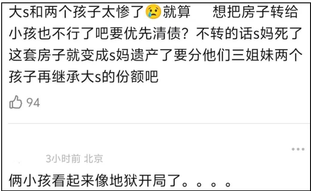 所以大S子女未来要面对的烂摊子,包括但不限于,为亲妈留下的、自己不住的豪宅还贷、和自己亲生姥姥争遗产、找回妈妈留下的珠宝等贵重物品…