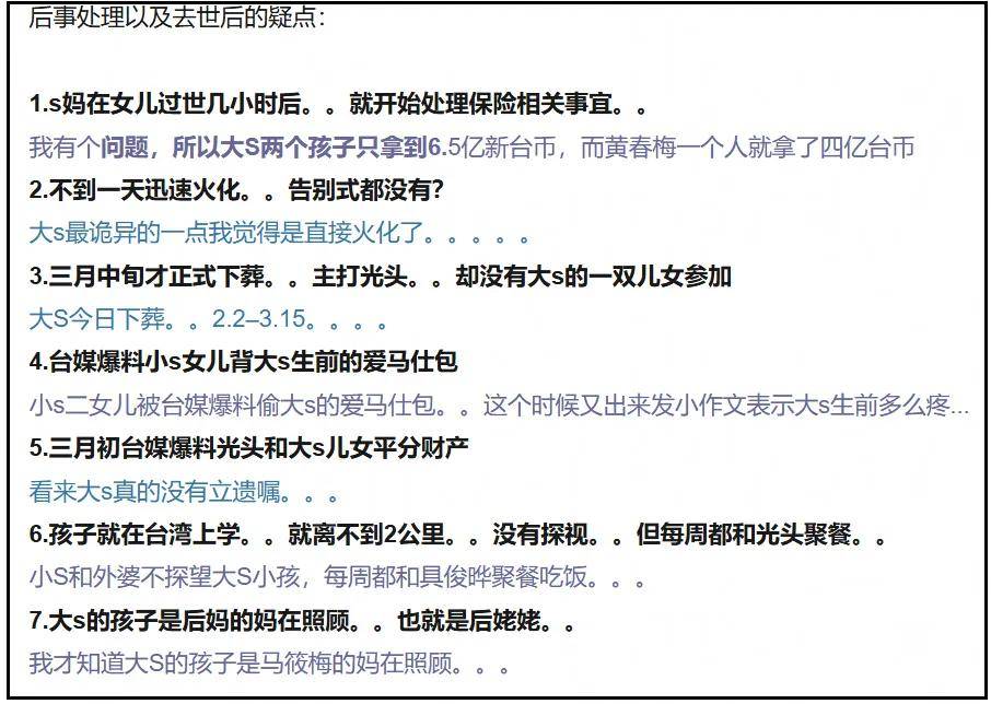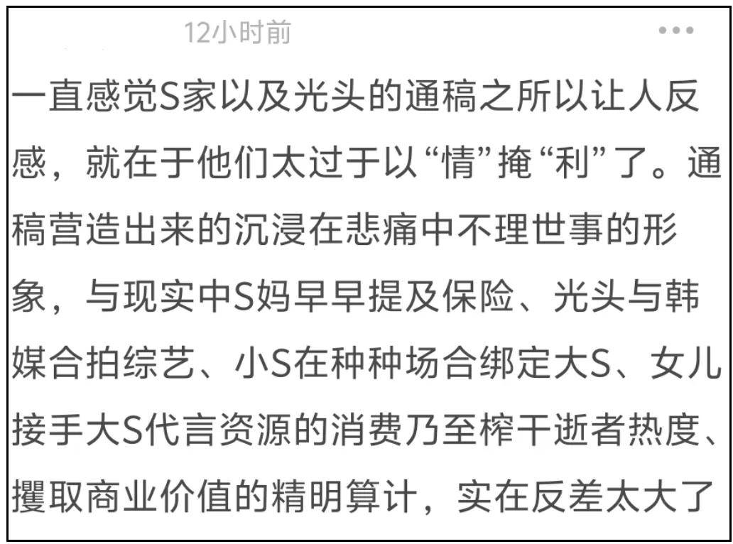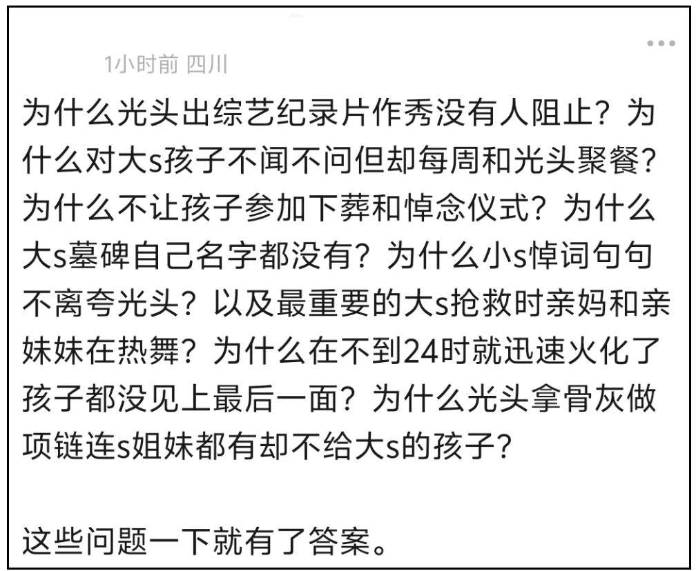 ——真正有效的回应,不是应该晒出把大S遗产交接给大S子女的证据吗?哪怕几张照片、几条聊天记录,小S几句话都含糊过去了,难道要等大S孩子长大之后,才会有真相吗?