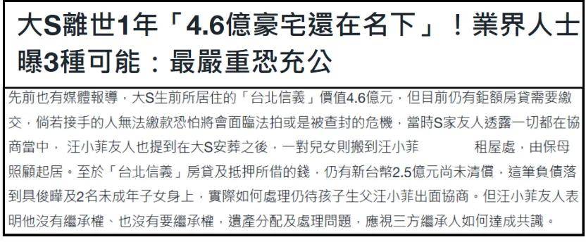 台媒报道大S去世一年了,她名下的豪宅还没有过户,原因是谁继承了豪宅,谁就继承了债务。