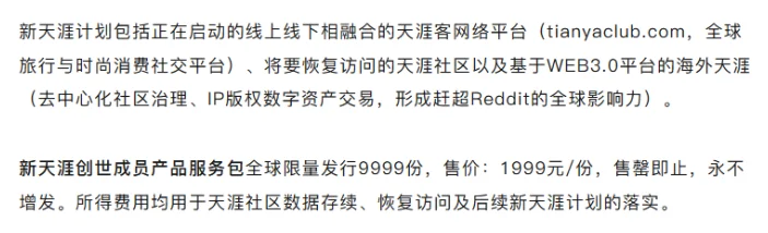 其中,天涯客平台将会招募 9999 位创世成员,每位收取 1999 元。
