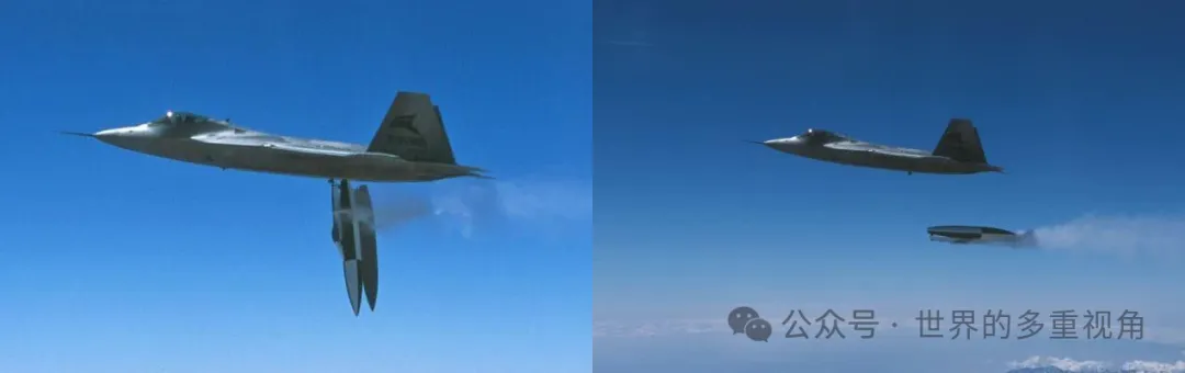 这是F-22在测试抛离副油箱和挂架,副油箱的黑白涂装是为了更好的观察抛离后的运动轨迹。