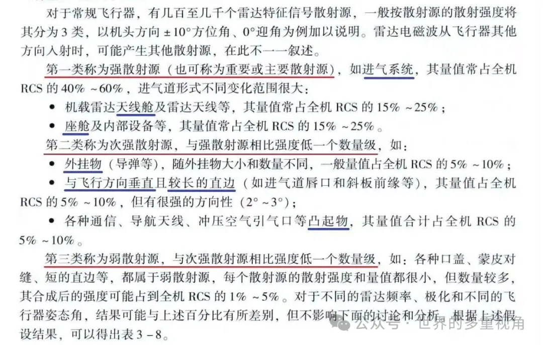 根据相关论文研究,飞机的RCS值,最大的来源是进气系统、雷达天线舱、座舱这三个部分贡献的,其次才是外挂物。
