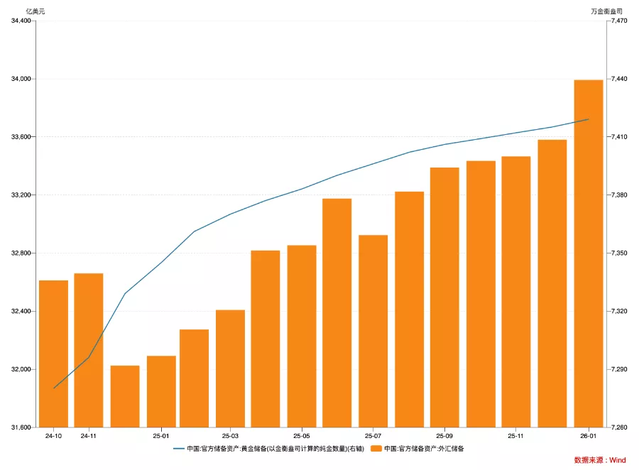 黄金储备方面,央行连续第15个月增持黄金。同日,央行公布数据显示,2026年1月末黄金储备报7419万盎司,2025年12月末为7415万盎司,环比增加4万盎司,增持量较上个月小幅上涨。