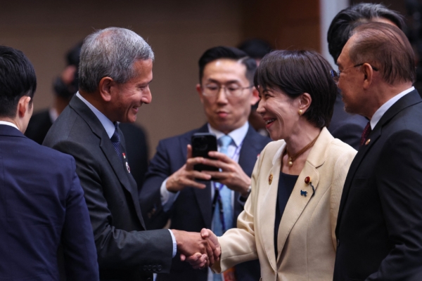 2025年10月26日,在吉隆坡举行的第47届东南亚国家联盟(ASEAN)峰会期间,新加坡外交部长维文.巴拉克里希南(左)与日本首相高市早苗(右)会面。(Chalinee Thirasupa/POOL/AFP via Getty Images)