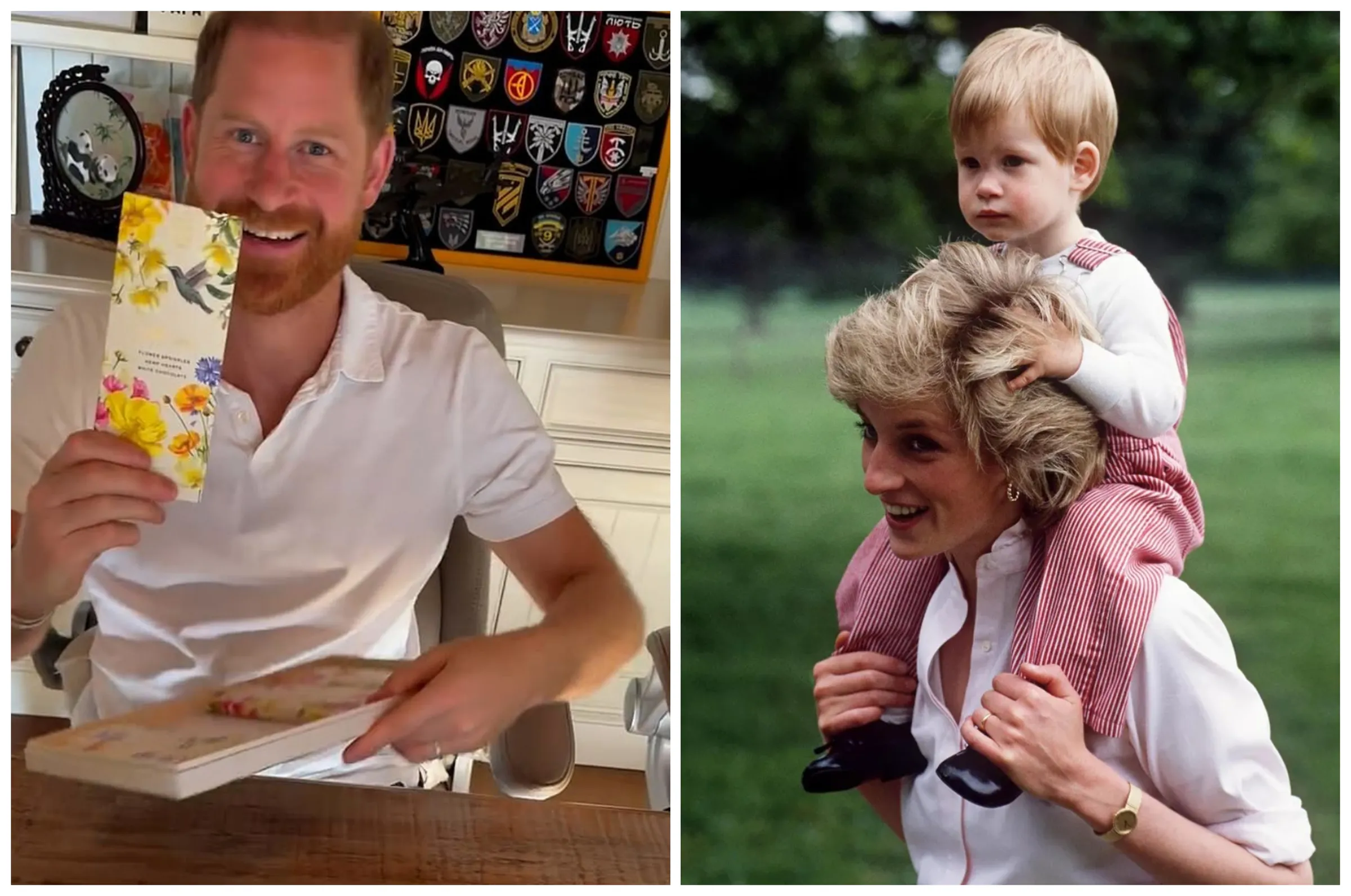 哈利王子 在加州住家书房中收到妻子准备的巧克力惊喜,身后墙面上可见他与母亲黛妃的回忆。(翻摄meghan IG/mychal3ts Threads)