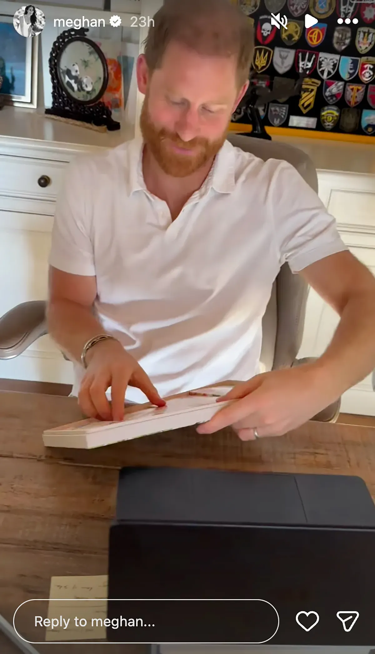 哈利在书房拆开巧克力的瞬间,被梅根拍下来。(翻摄 meghan IG)