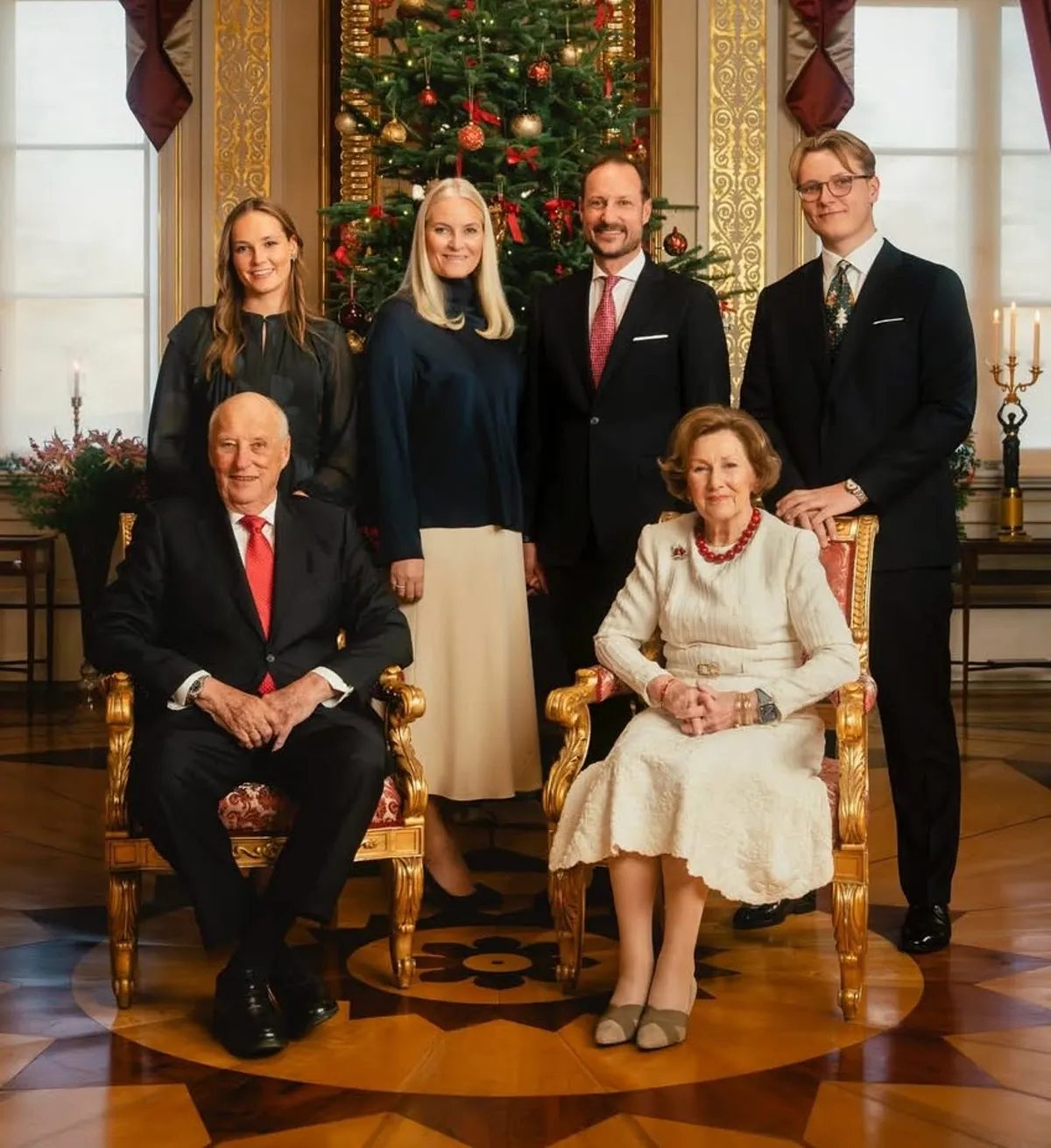 挪威王室成员,前排左起为国王哈拉尔五世、索妮亚王后;后排由左至右依序为英格丽德公主、玛丽特王储妃、哈康王储,以及马格努斯王子。(翻摄detnorskekongehus IG)