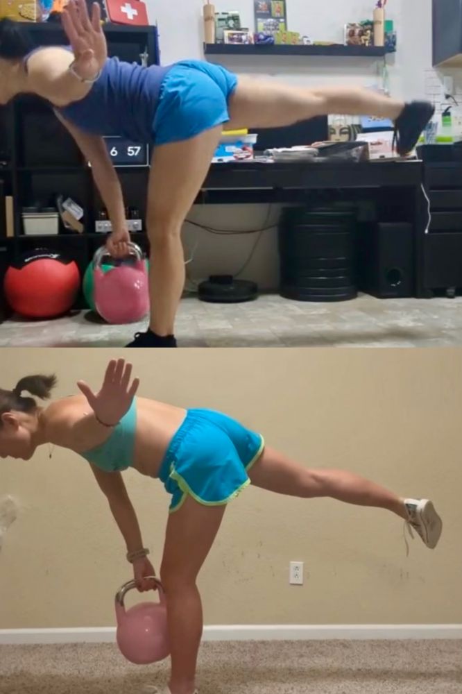 有一个就是这样单手拿着壶铃,然后身体弯下去,一条腿抬起来。要点是保持上身和腿在一个水平。然后直起来身来,然后再下去。脚不能碰地。一边做十个。换一边。