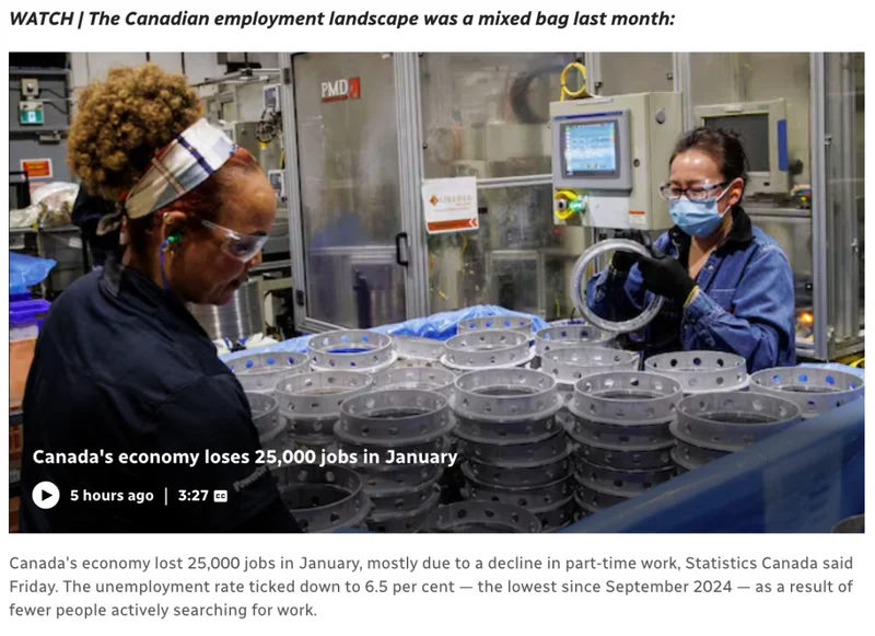加拿大统计局周五表示,1月份加拿大就业形势喜忧参半,经济损失了25000个工作岗位,但失业率降至6.5%。据数据机构称,失业率降至2024年9月以来的最低水平,这是由于积极寻找工作的人数减少所致。