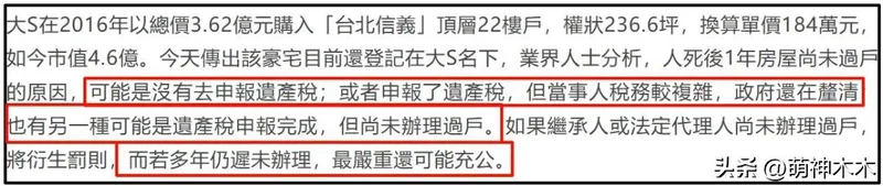 此前台媒爆料,具俊晔会放弃遗产继承,都给两个孩子,部分网友得知之后还很感动。没想到台媒又爆料称大S的豪宅至今仍在她名下,疑似是因为遗产税的问题,迟迟没有办理过户,如果多年都不办理的话,最严重的情况,甚至可能充公。