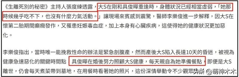 除此之外,韩综还爆料大S和具俊晔重逢时,身体状况就已经很虚弱,“她那时候几乎吃不下,也没什么力气活动”,在场还有医师说大S健康急速恶化的关键时间点是生二胎的时候。