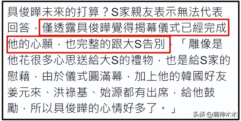 S家还透露,具俊晔觉得雕像揭幕仪式已经完成了他的心愿,也完整的跟大S告别了。